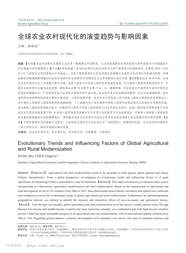 近日,中国农业科学院农业经济与发展研究所陈秧分研究员团队在《中国农业科学》刊发了题为“全球农业农村现代化的演变趋势与影响因素”的研究成果,聚焦农业现代化和农村现代化两个维度构建评价指标体系,运用三维核密度估计和空间基尼系数揭示全球农业农村现代化的演变趋势,借助最优参数地理探测器识别社会经济因素和农业因素的作用强度及交互作用影响力。该成果是国家社科基金重大项目(21&ZD093)、教育部哲学社会科学重大课题攻关项目(23JZD008)、中国农业科学院科学中心重大任务(CAAS-CSAERD-202402)、中国农业科学院科技创新工程项目(10-IAED-04-2025)等专项研究的阶段性成果。