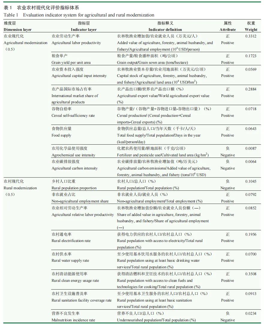从马克思主义政治经济学的视域看,农业现代化与农村现代化分别对应生产力与生产关系,前者为后者奠定物质基础,后者则为前者提供空间保障。因此,农业农村现代化是农业现代化和农村现代化有机耦合而成的互有联系、彼此促进、相互交融的整体,可从农业现代化和农村现代化两个维度进行统筹考虑。基于科学性、系统性、可量化性、可操作性原则以及前人研究的成果,本研究构建包括两个维度16个指标的农业农村现代化评价指标体系(表1),旨在实现以下两个层面的目标:一是构建一个能够反映“生产力”(农业现代化)与“生产关系”(农村现代化)协同发展的量化标尺,以客观测度全球各国的农业农村现代化水平。这不仅是进行国际比较的基础,更是精准定位中国农业农村发展阶段的前提。二是将测度结果作为因变量,识别影响农业农村现代化的关键驱动因素及其交互作用。以此区分一般性规律与差异性影响,从而为中国推进乡村全面振兴提供来自全球经验的实证启示。