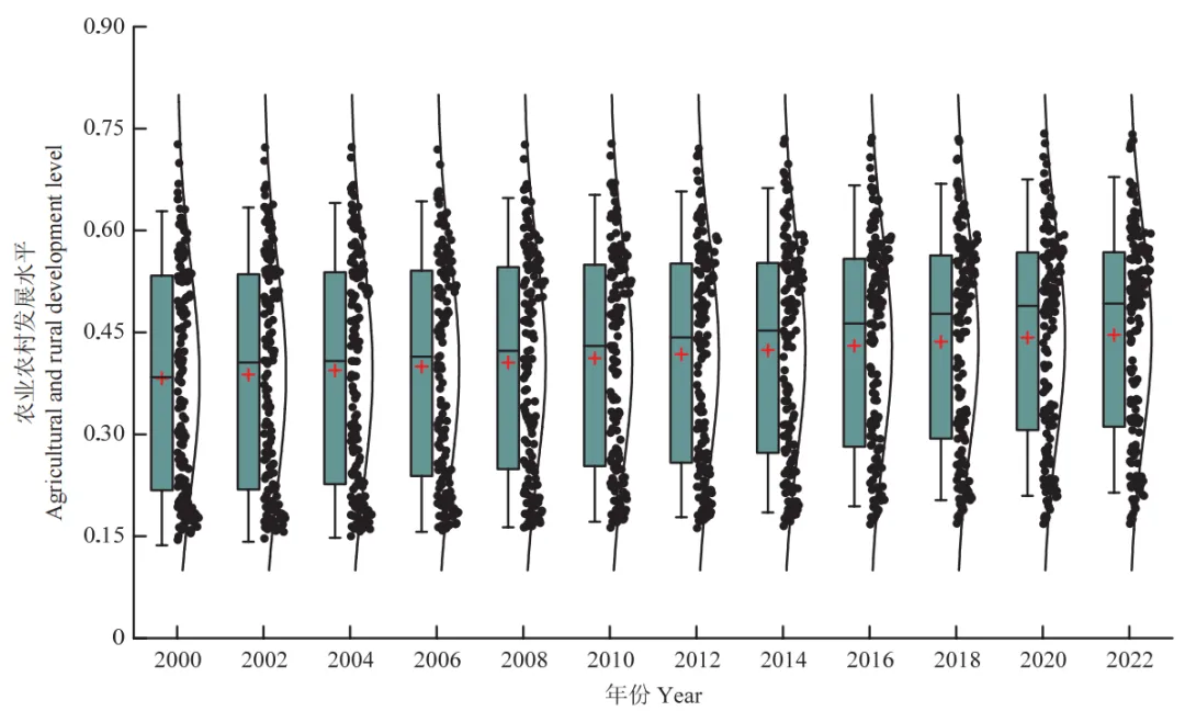 全球农业农村发展水平在 2000—2022 年呈现稳步增长态势,国别差距呈现收敛趋势,上下四分位数(即箱形上下边框)间距随着时间的推移有所缩小,各年份农业农村发展水平低于平均水平的国家数量在逐年减少,中国农业农村发展水平的提升较为显著,国际排名从 2000 年的第 78位上升至 2022 年的第 57 位。
