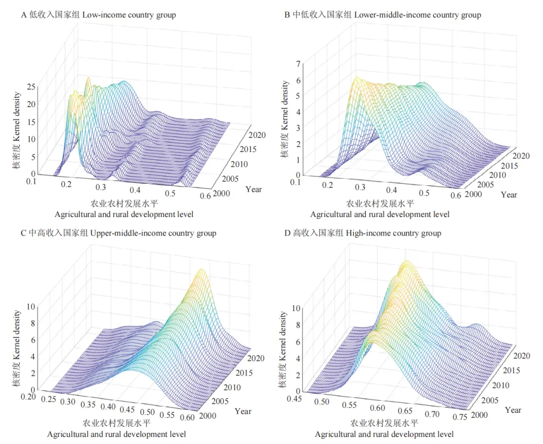 研究采用世界银行发布的分类标准,将全球 152 个国家划分为低收入、中低收入、中高收入和高收入国家组,采用三维核密度估计来揭示各国家组的时间演进特征(图2)。从中心位置看,四组国家的核密度曲线均右移,表明各国农业农村发展水平在研究期内普遍提升。但低收入和中低收入国家的中心位置仍明显偏左,说明全球范围内该领域的发展水平仍存在显著分层。从分布形态看,低收入和中低收入国家的曲线主峰高度趋于下降,显示其内部差距在拉大;而中高收入与高收入国家的主峰则变得“尖而窄”,说明其内部差距在缩小、均衡性增强。从分布延展性看,低收入国家曲线存在明显右拖尾,表明有部分国家向更高水平收敛;其他三组国家曲线虽相对集中,但仍可见一定尾部延伸,反映出内部存在发展进程不一的个体。从极化趋势看,四组国家的曲线均无明显“双峰”特征,说明各组内部未出现显著的两极分化现象。