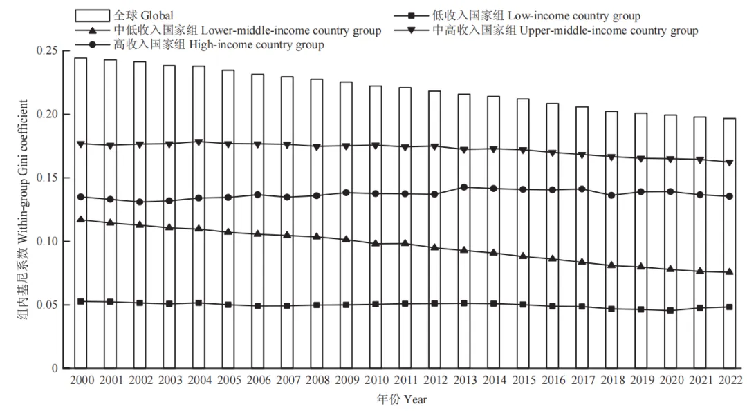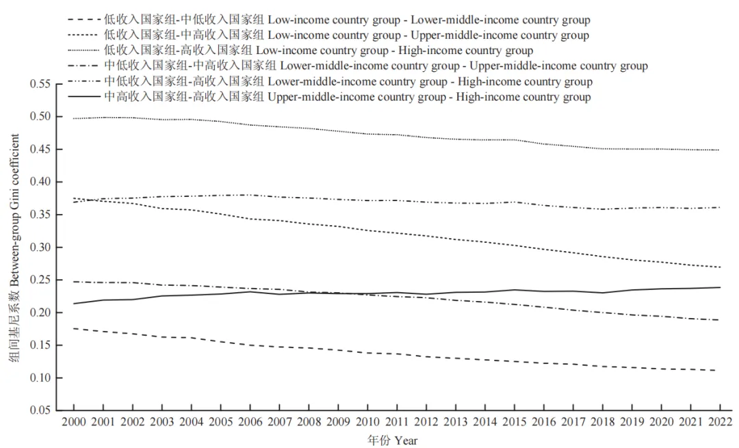 从总体基尼系数的变化趋势来看(表 2),全球农业农村发展水平的空间差异呈逐年缩小趋势。总体基尼系数从 2000 年的0.2444 下降到 2022 年的 0.1967,降幅达 19.52%,表明全球范围内的空间非均衡程度趋于减弱。就组内差异而言,中高收入国家组的组内差异最大,高收入国家组次之,中低收入国家组位列第三,而低收入国家组的组内差异最小(图 3)。就组间差异而言,低收入国家在不同程度上追赶中等收入国家,但难以追赶高收入国家(图 4)。值得注意的是,中高收入国家与高收入国家的农业农村发展差距呈逆向扩大态势,二者组间基尼系数在 2000—2022 年间有所增大,表明中高收入国家在农业农村现代化方面可能面临结构性挑战,导致与高收入国家的差距不降反升。