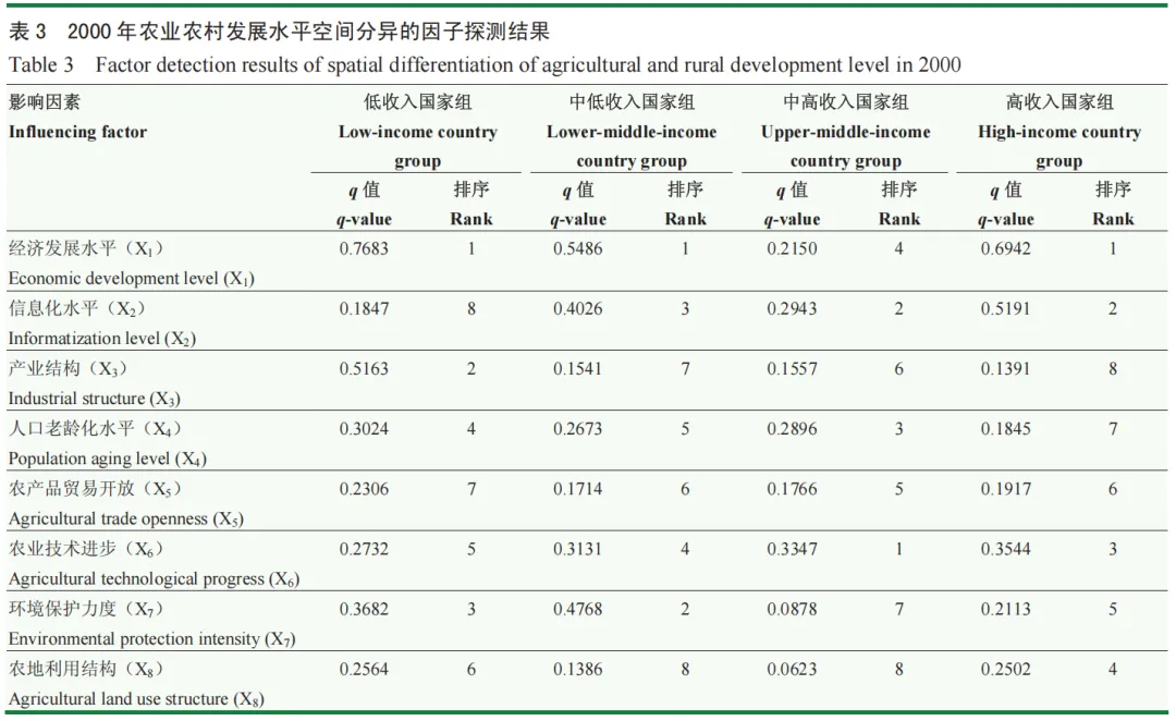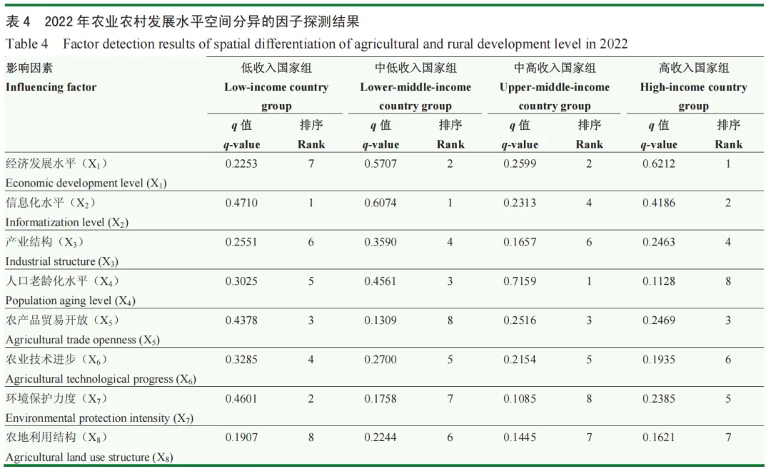 利用因子探测识别各影响因素在各国家组中的作用强度,发现不同国家组的影响因素存在若干普遍性规律(表 3、表4)。经济发展水平在各国家组中均表现出显著影响力,印证了经济增长对农业农村现代化的根本支撑作用。产业结构对除低收入国家组外的其他国家组具有持续增强的影响力,体现出产业转型在农业农村发展中的地位不断上升。农产品贸易开放在低收入、中高收入和高收入国家组中的作用强度显著增强,反映了全球化背景下农业对外开放对农业农村发展的重要推动作用。同时,农业技术进步对各国家组的影响力普遍减弱,反映了技术因素已趋于内生化,其边际解释力相对下降;而农地利用结构影响力的普遍较弱且变化有限,则揭示了农地利用结构对农业农村发展的影响具有长期性和复杂性特征。