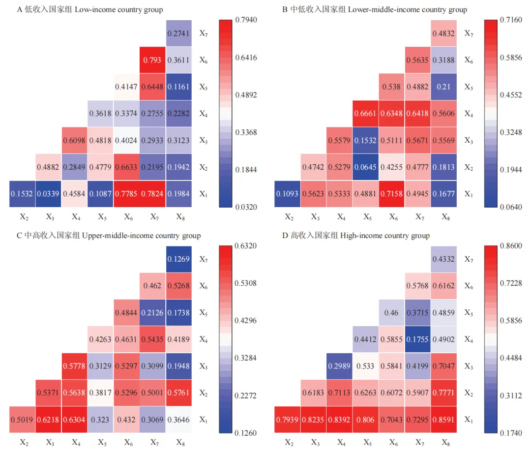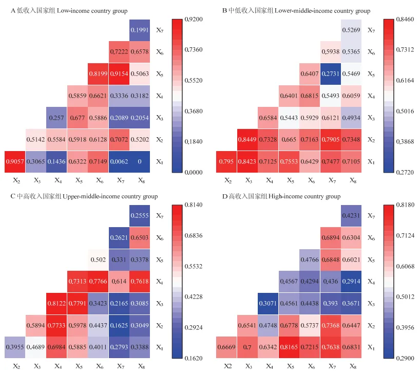 在因子探测的基础上,结合交互探测进一步评估各因素间交互作用是否会增强或减弱对农业农村发展水平的影响力。当两因素间的交互作用影响力大于各自单独作用时,交互作用表现为正协同效应;当小于其中任一因素的影响力时,则为负协同效应。根据图5和图6可知,8个因素之间均存在交互作用,表明农业农村现代化受到多重因素的综合影响。低收入国家组两两因素产生负向交互作用的比例由 60.71%下降至 28.57%,说明其农业农村发展正从要素约束向要素互促转变。中低收入国家组各因素间的交互作用呈现从正负协同效应并存向全部正协同效应转变的趋势,说明其农业农村发展已形成良性互动的内生机制。中高收入和高收入国家组各因素间普遍存在协同增强效应,说明其农业农村发展较早受到多重因素影响。