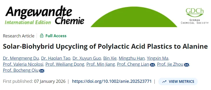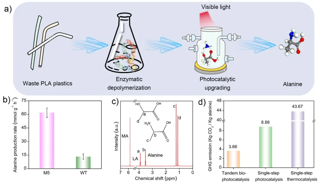 利用太阳能-生物杂化体系将聚乳酸塑料升级回收为丙氨酸https://doi.org/10.1002/anie.202523771将废旧塑料升级回收为氨基酸等大宗化学品,是实现负碳排放和构建循环碳经济的一条颇具前景的途径。然而,现有的热催化方法通常需要严苛的反应条件。虽然光催化升级回收在温和条件下即可进行,但其在塑料预处理阶段依赖高温水解步骤,这削弱了其整体的实用性。在此,我们报道了一种生物-光催化杂化体系,该体系可在环境条件下将聚乳酸(PLA)塑料转化为丙氨酸。该集成体系首先在由微单孢菌属菌株衍生而来的工程肽酶催化下,于55°C、pH 10的条件下将PLA酶解聚为乳酸(LA),转化率达92%。所得水解液无需任何纯化,直接输入光合作用体系,在该体系中,以氨为氮源,在Ni/ZnIn2S4催化剂作用下,LA单体被转化为丙氨酸。该光催化过程通过含氧自由基中间体途径进行,丙氨酸生产速率达61.91 mmol g⁻¹ h⁻¹,总产率为60%。生命周期评估表明,与单步热催化和光催化体系相比,我们的串联生物-光转化体系大幅降低了碳足迹。因此,本研究为从低成本原料生产高附加值化学品开辟了一条可持续途径。丙氨酸是蛋白质合成的基本结构单元,在制药和食品生产领域得到了广泛应用。传统丙氨酸合成方法基于施特雷克(Strecker)法,该方法使用剧毒氮源(如氰化物)和非可再生原料(如醛类),且涉及复杂且劳动密集的工艺流程。相比之下,热催化方法能够以低成本的乳酸(LA)为原料生产丙氨酸;然而,该方法需要严苛的反应条件,包括高温和高压氢气。光催化技术已展现出在温和条件下将LA转化为丙氨酸的能力。Fu等人报道了一个典型案例,他们使用CdS/Ti₃C₂ MXene催化剂实现了LA的光催化增值转化,生成丙氨酸,表现出33.72 mmol·g⁻¹·h⁻¹的高活性。[此外,LA平台分子可通过废旧聚乳酸(PLA)塑料的解聚可持续获得。因此,预计从PLA出发进行光催化合成丙氨酸将为丙氨酸生产提供一条经济可行的途径,同时为缓解全球塑料污染提供一种可持续解决方案。