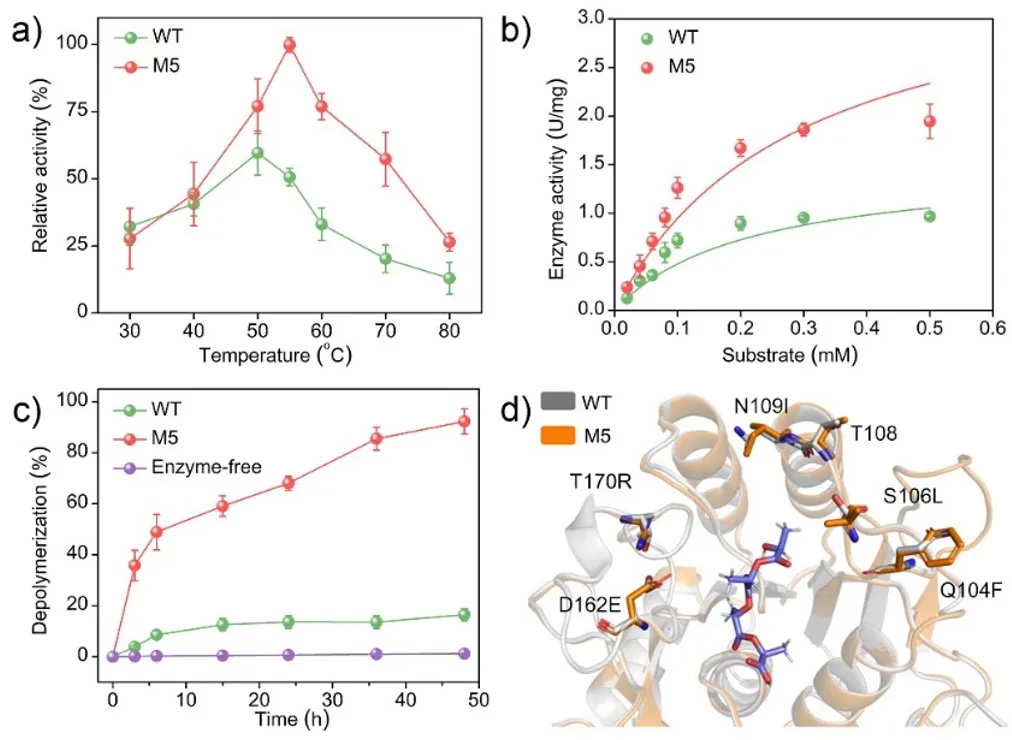 图1. WT酶和M5变体酶对PLA水解的生物催化性能