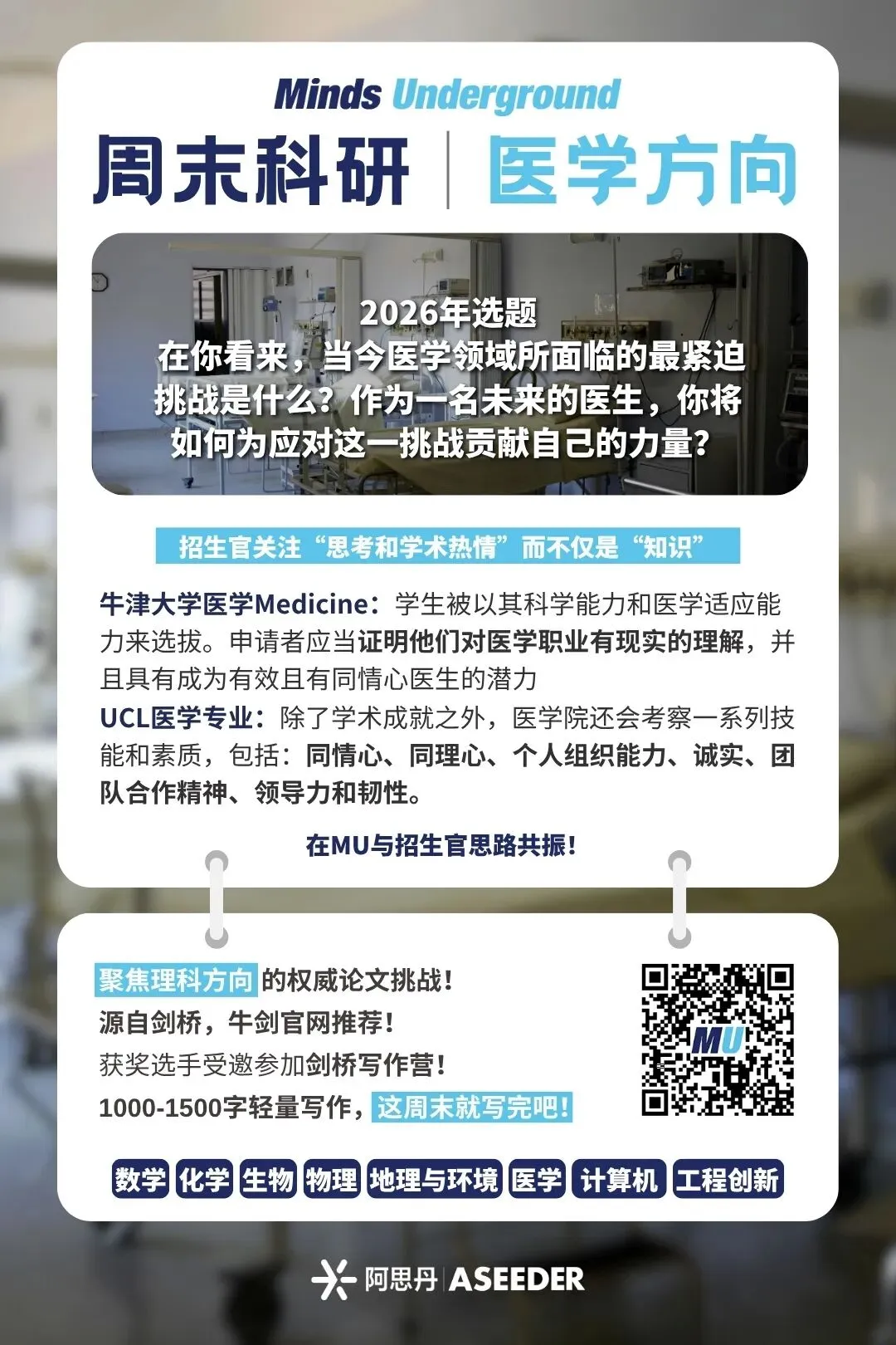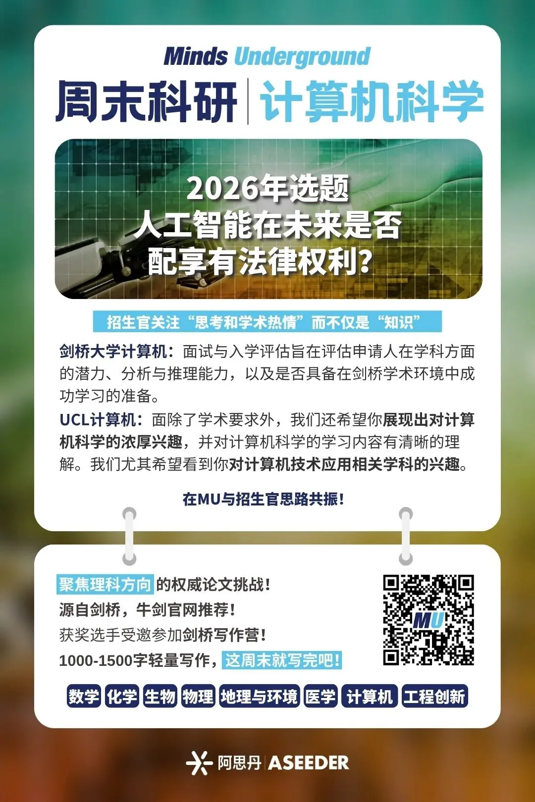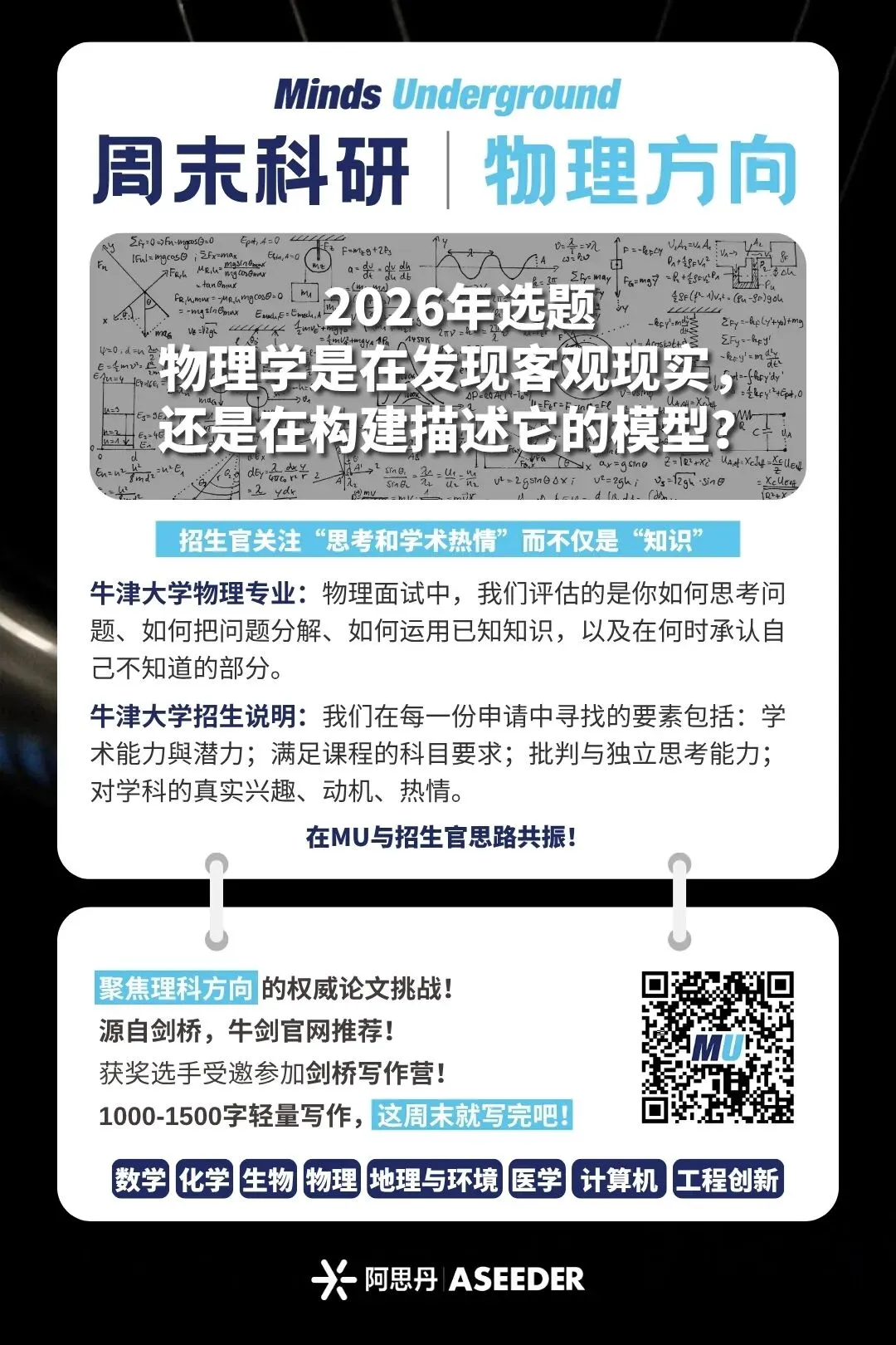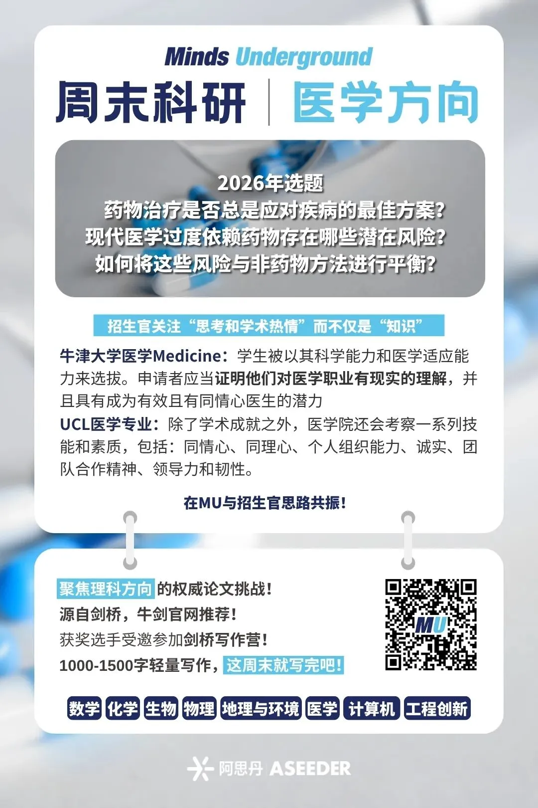是由创办于英国剑桥的 Minds Underground(简称 MU)学术组织主办的写作挑战活动,2026年度开放两个年龄组别。15-18岁组区分学科,学科涵盖八大学科:数学、生物、化学、物理、地理与环境、医学与健康、计算机科学、工程,旨在鼓励学生激发想象力,提出超越学科限制和课本知识的创新观点;8-14岁不区分学科,共3道趣味选题,助力家长抓住表达力培养黄金期!