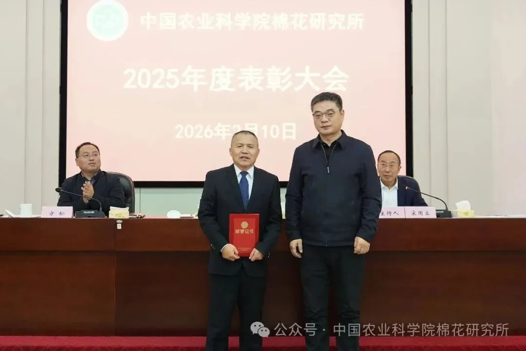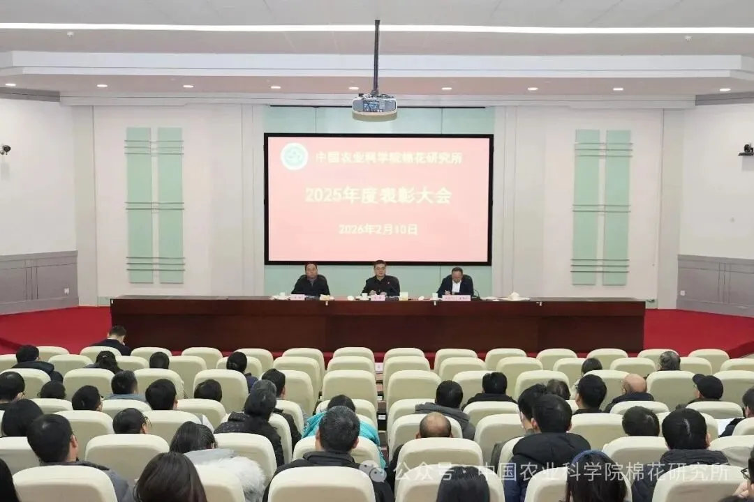 2026年2月10日,中国农业科学院棉花研究所组织召开2025年度表彰大会。所长、党委书记高雷就中棉所2026年重点工作进行安排部署,副所长宋国立传达中国农业科学院2026年工作会议精神,副所长方松宣读关于科技创新、成果转化等方面的表彰决定。会议指出,2025年中棉所各项工作取得了较大进展,全所上下信心倍增,精神面貌焕然一新。2026年,中棉所要继续坚持全面从严治党,贯彻“以科学为中心、以奋斗者为本、做有组织科研、全产业链创新”的核心理念,团结一心,凝聚合力,推动棉花科技事业再攀高峰,重点做好以下工作:一要深化科技创新攻关。聚焦国家重大战略需求,全力推进“十五五”项目申报。以棉花生物育种与综合利用全国重点实验室为统领,按照“有组织、全链条、国际化”科研方向,锚定任务目标,做强棉花育种研究,补齐棉花综合利用学科短板,强化分子生物学等研究,力争在国际顶尖期刊发表原创性成果;二要加大成果转化力度。围绕产业需求,以品种推广、技术转让为抓手,深化与新疆中棉种业有限公司科企融合,鼓励科研人员主动对接生产一线,推动科技成果向现实生产力转化;三要加强人才队伍建设。坚持管理服务科研的理念,选拔群众满意、忠诚担当的管理人才,强化青年人才培养,引导职工树立清晰目标,激发干事创业活力;四要激活区域协同动能。进一步明确安徽、郑州所区及南北疆试验站的战略定位和区域功能目标,形成全所一盘棋的发展格局;五要凝聚精神价值共识。深入弘扬“中棉所精神”,践行核心价值观,营造团结、包容的工作氛围,通过思想引领形成巨大凝聚力;六要严守纪律规矩底线。坚持“严”字当头,加强廉洁自律,严格执行民主集中制,全面强化政治建设、思想建设、组织建设、作风建设、纪律建设,筑牢思想防线,以风清气正的政治生态保障各项任务稳步推进,全力推动研究所“十五五”发展。会议强调,人人都是中棉所重要组成部分,中棉所发展需要人人共同努力。中棉所人要树立一个远大的人生目标,心有所向,和所党委、所班子保持高度一致,形成强大的凝聚力。所领导班子要牢固树立全心全意为人民服务的理念,坚持公正公平公开的原则,带领全所职工发挥国家战略科技力量作用,扛起棉花国家队的重大责任,共同开创工作新局面。