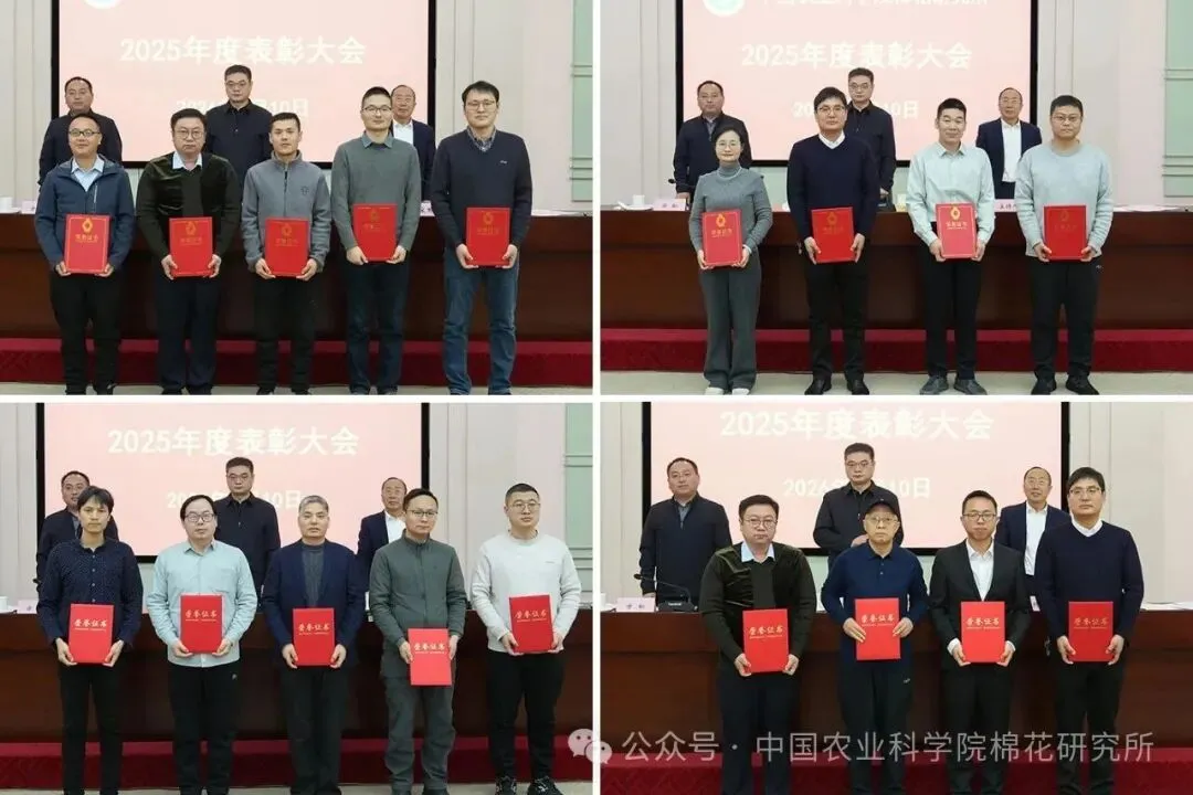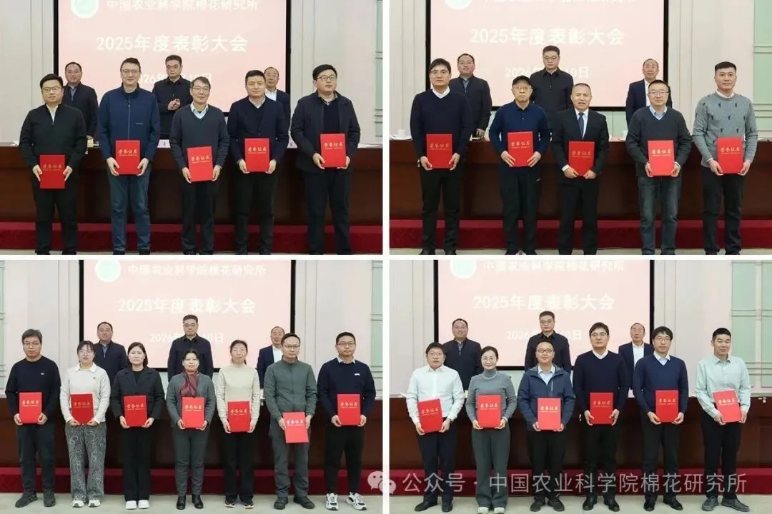 会议还公布了中棉所战略科学家和青年育种科学家聘任人选,对2025年度科技创新先进集体和个人、优秀青年科学家、成果转化先进集体、乡村振兴先进个人及年度考核优秀人员等进行表彰,通报了获得上级有关部门表扬信的部门和人员情况,并就廉政过节和安全生产等工作提出明确要求。