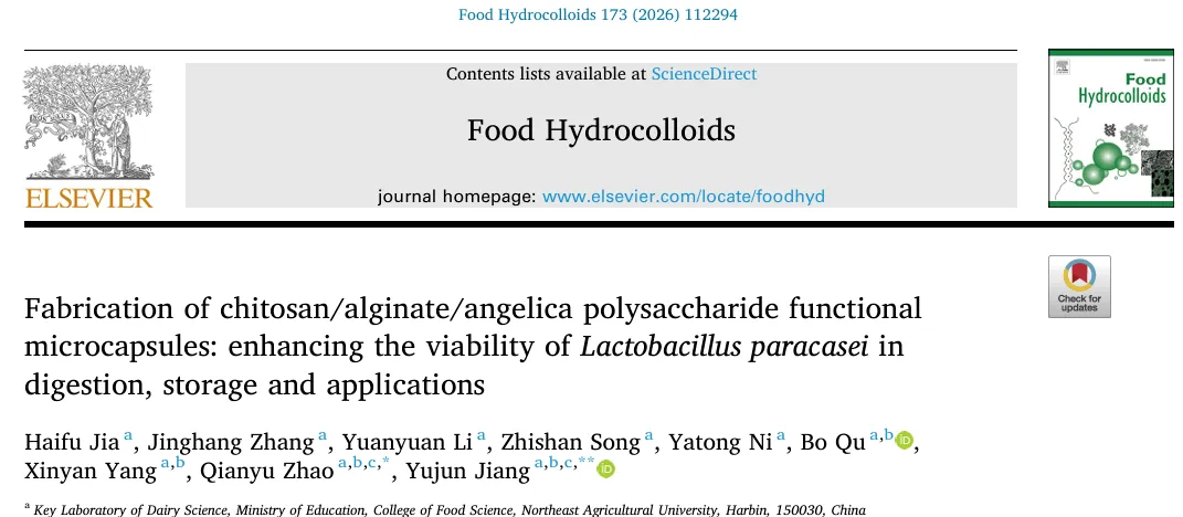 东北农业大学赵倩玉副教授、姜毓君教授团队:多糖基功能性微胶囊的制备:提高副干酪乳杆菌在消化、储存和应用过程中的活力