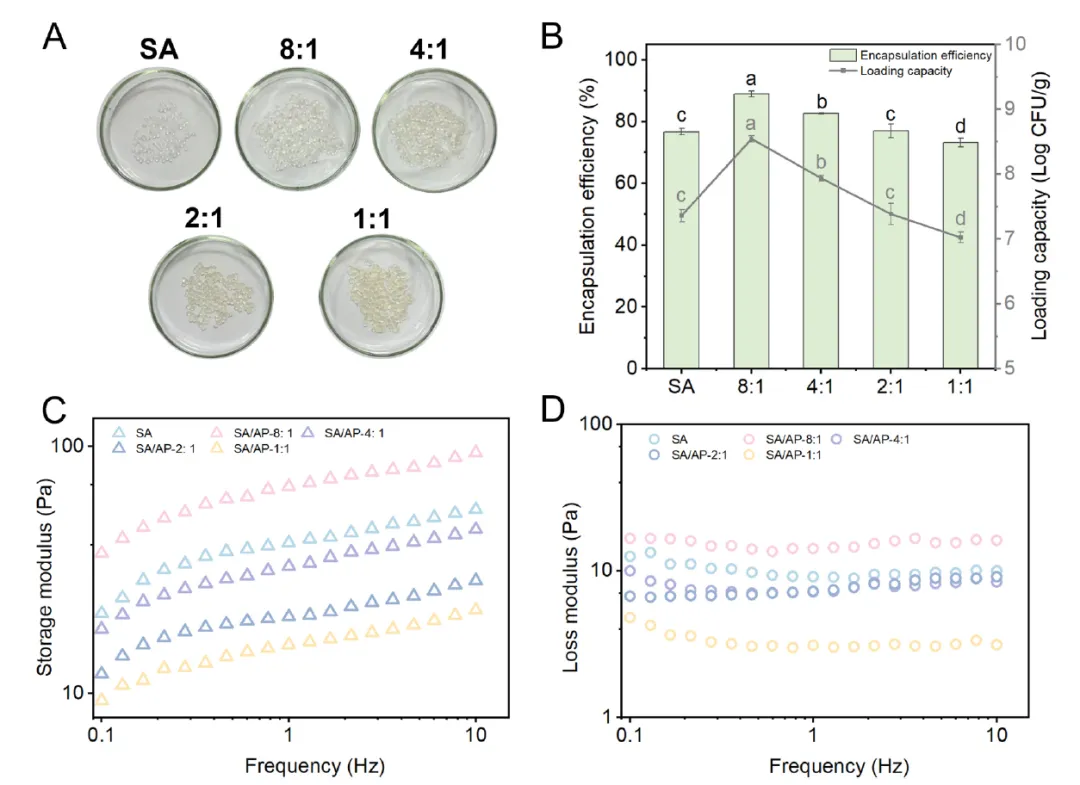 图2.不同SA/AP复合比例制备的微胶囊照片(A)、包封率及载菌量(B)、储能模量G’(C)和损耗模量G''(D)