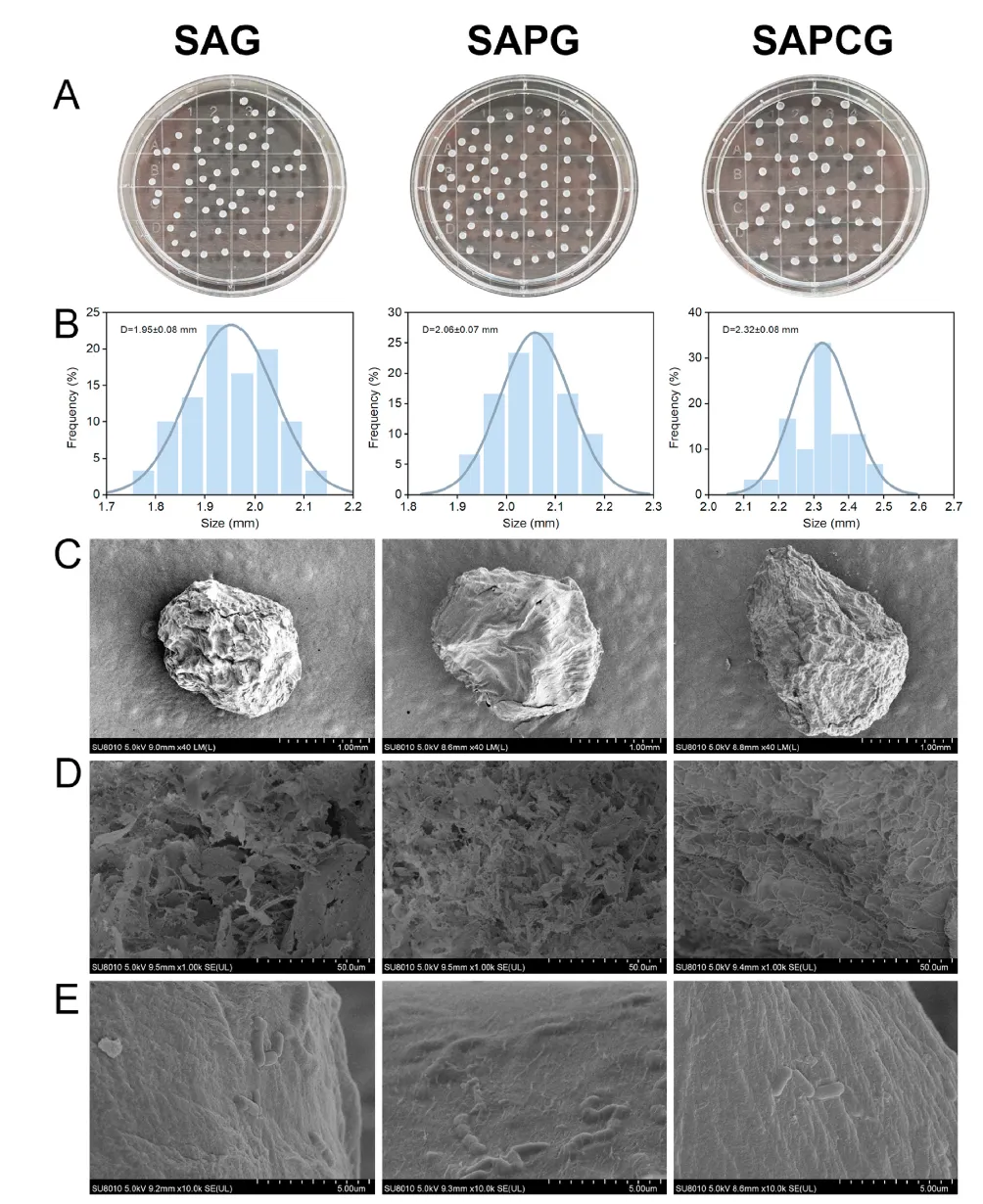 (3)考察了纯海藻酸钙凝胶(SAG)、SA/AP复合凝胶(SAPG)及添加壳聚糖(CS)涂层的SA/AP复合凝胶(SAPCG)的相关特性。所有微胶囊均呈圆形,且均具有良好的溶胀性能和热稳定性。不同之处在于,SAPG和SAPCG表现出更优的抗消化性、冻干耐受性、耐热性、模拟释放性能及贮藏稳定性。