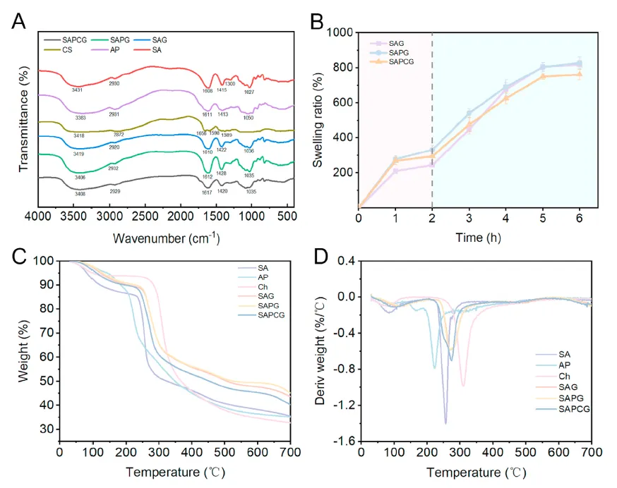 图5.(A)不同物质的傅里叶变换红外光谱(FTIR);(B)微胶囊溶出率;(C)不同物质的热重分析(TGA)曲线;(D)不同物质的微分热重(DTG)曲线。