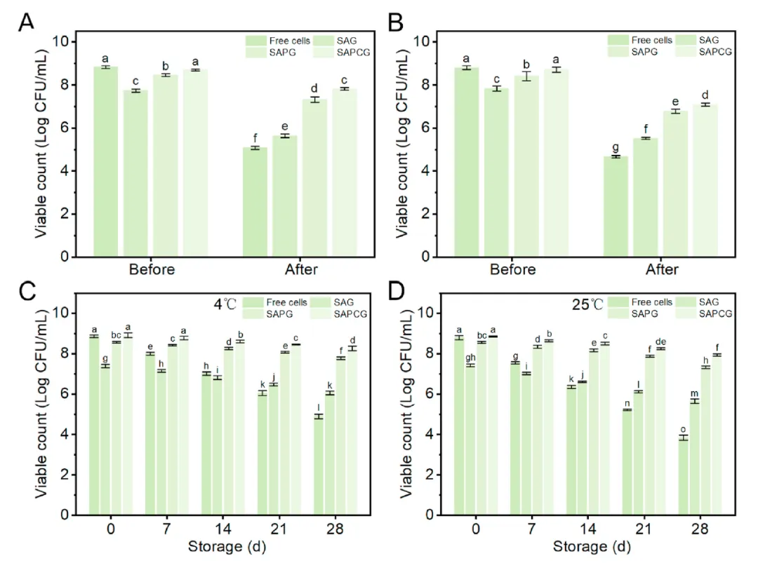 图7.微胶囊对冻干的耐受性(A)、对热处理的耐受性(B)、在4℃下的贮藏稳定性(C)、在25℃下的贮藏稳定性(D)。