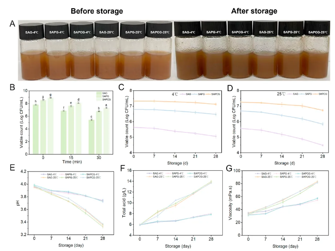 图8. 益生菌微胶囊在冻梨汁中的应用。(A)添加微胶囊的冻梨汁贮藏前后照片;(B)巴氏杀菌对冻梨汁中细菌活性的影响;(C)4℃贮藏、(D)25℃贮藏对冻梨汁中细菌活性的影响;以及贮藏期间冻梨汁的pH值(E)、总酸含量(F)和黏度(G)变化。