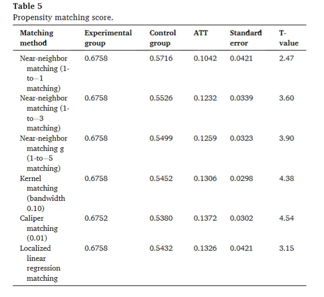 为检验基准回归结论的可信度,本研究采用倾向得分匹配(PSM)法进行稳健性检验,结果如表5所示。结果表明,无论采用最近邻匹配、核匹配、半径匹配还是局部线性回归匹配等方法,处理组的平均处理效应回归系数均具有统计显著性,这验证了即使经过倾向得分匹配处理,基准回归的结论依然成立。