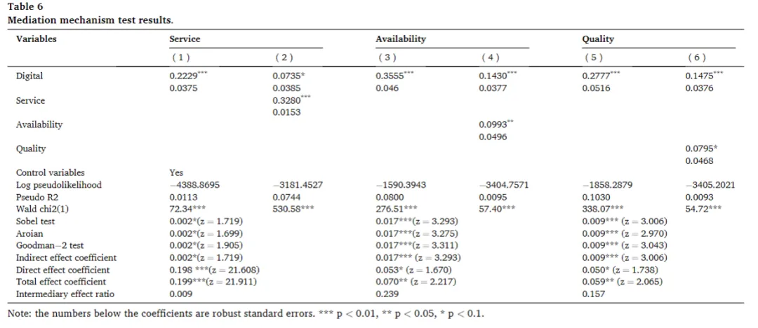 本文从农业社会化服务需求、农业产销信息可及性、农产品质量认证意识三个方面,分析了农民数字经济参与影响其保护性耕作行为的内在机制,结果如表6所示。模型(1)、(3)、(5)的回归结果表明,农民数字经济参与显著提升了其农业社会化服务需求、改善了农业产销信息可及性,并增强了农产品质量认证意识;模型(2)、(4)、(6)的结果显示,数字经济参与、农业社会化服务需求、农业产销信息可及性及农产品质量认证意识均通过了显著性检验。这表明,提升社会化服务需求、改善产销信息可及性、增强质量认证意识是数字经济影响农民保护性耕作行为的重要传导机制。