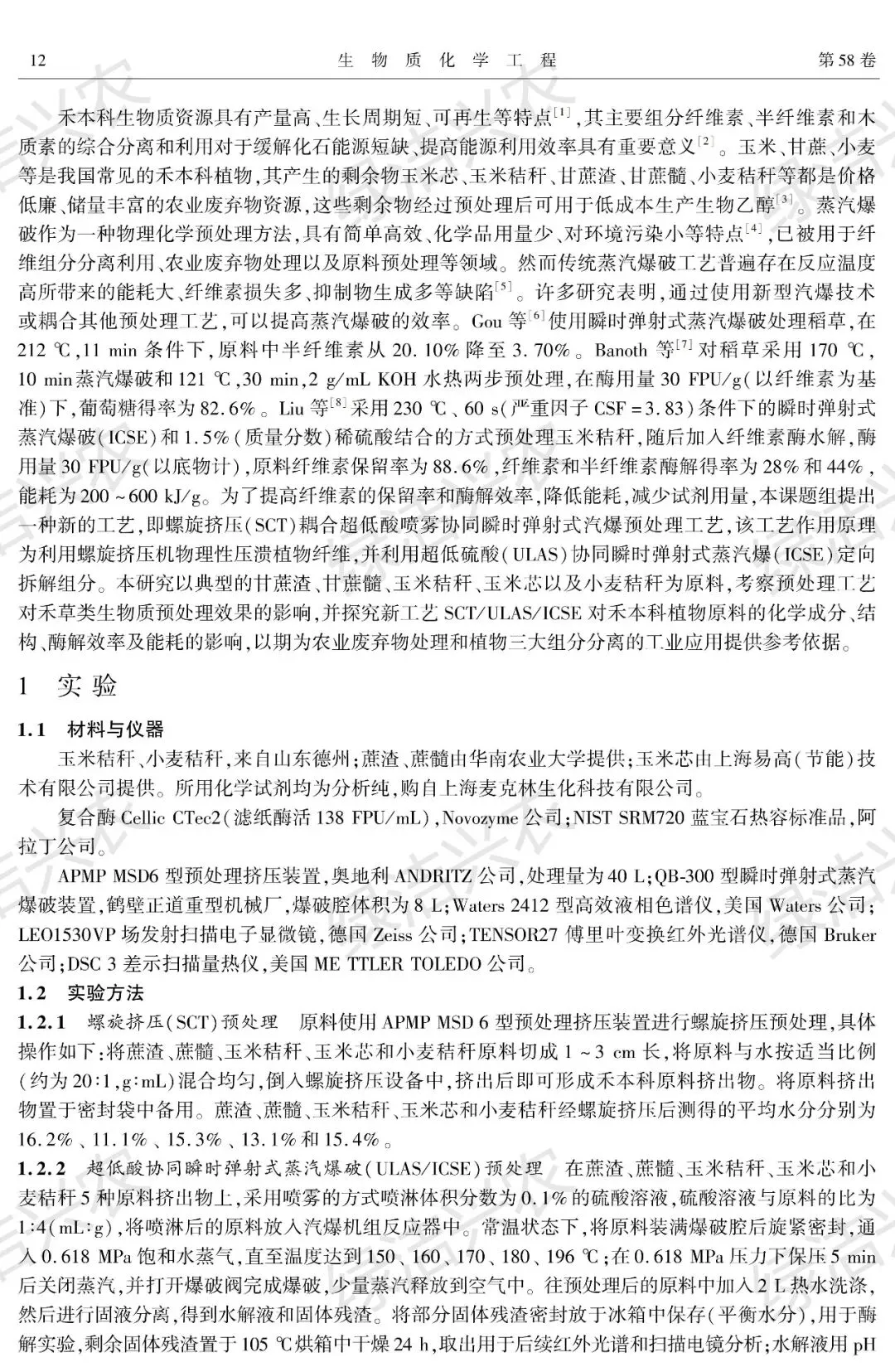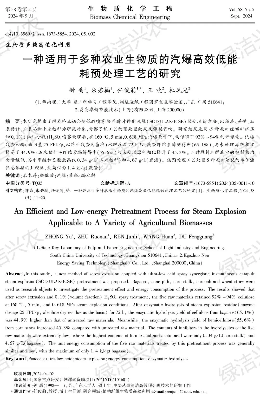 《一种适用于多种农业生物质的汽爆高效低能耗预处理工艺的研究》【生物质化学工程】2024年9月