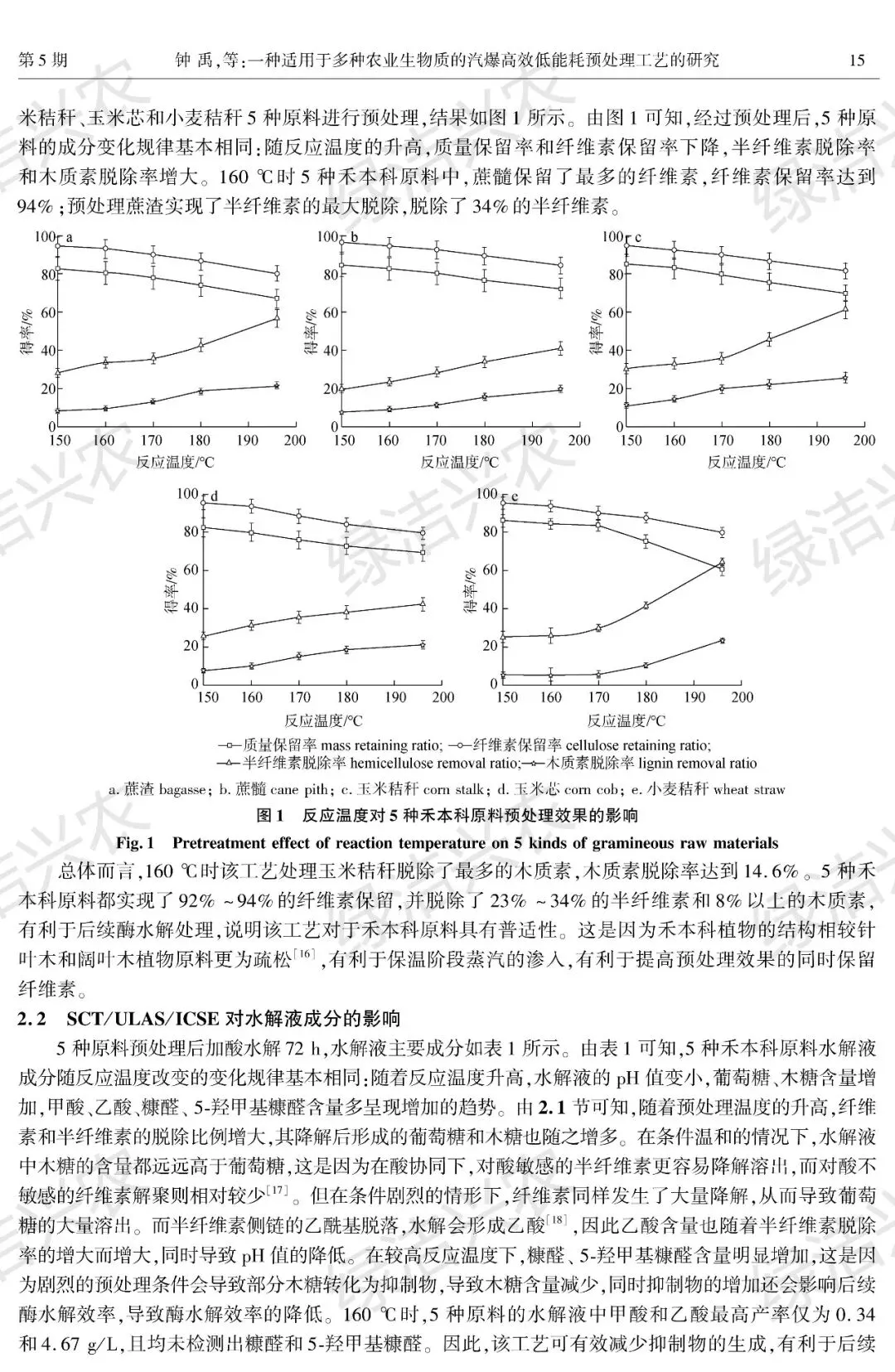 1. 预处理效果(最优条件:160℃、5 min、0.618 MPa)