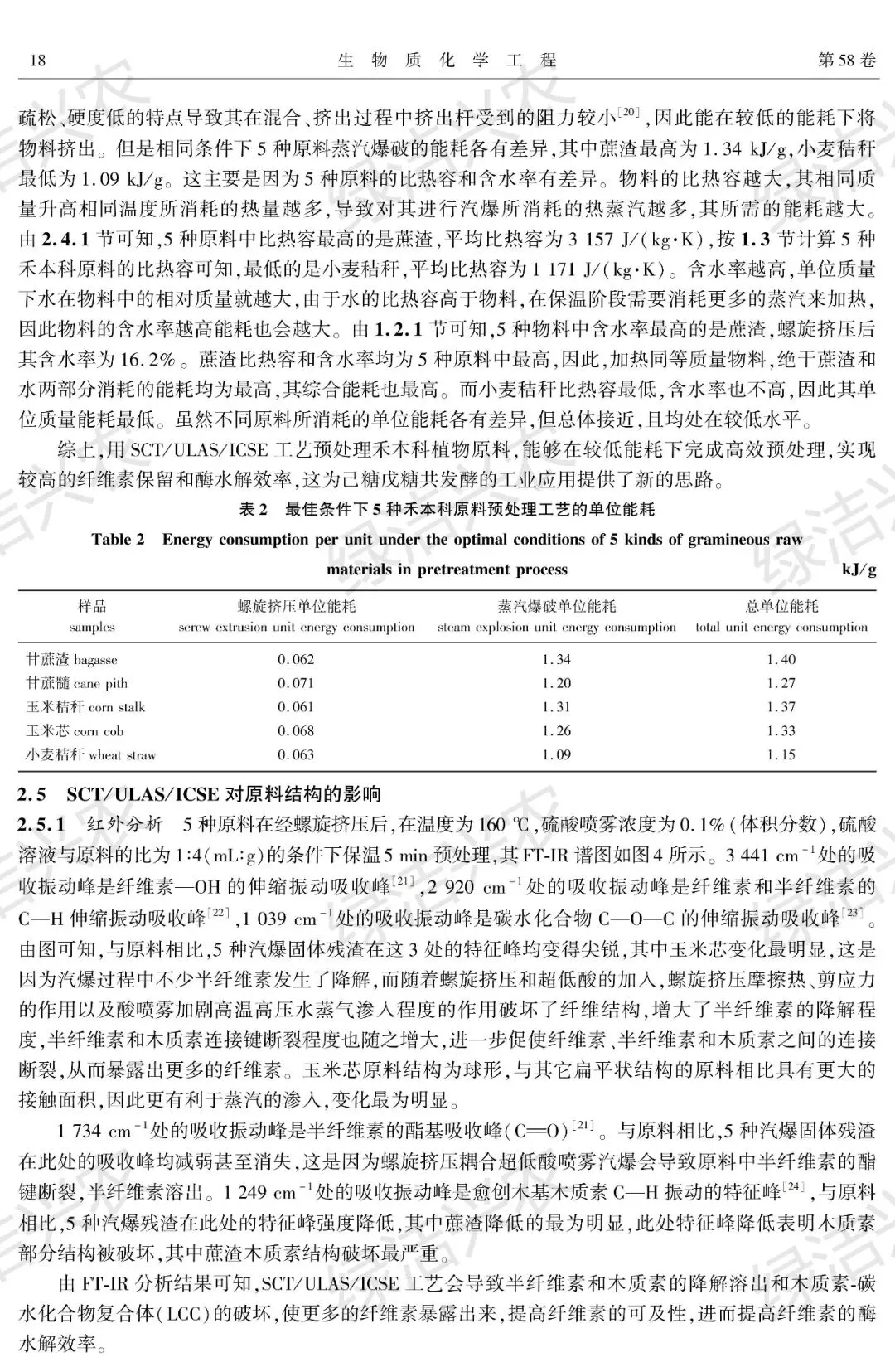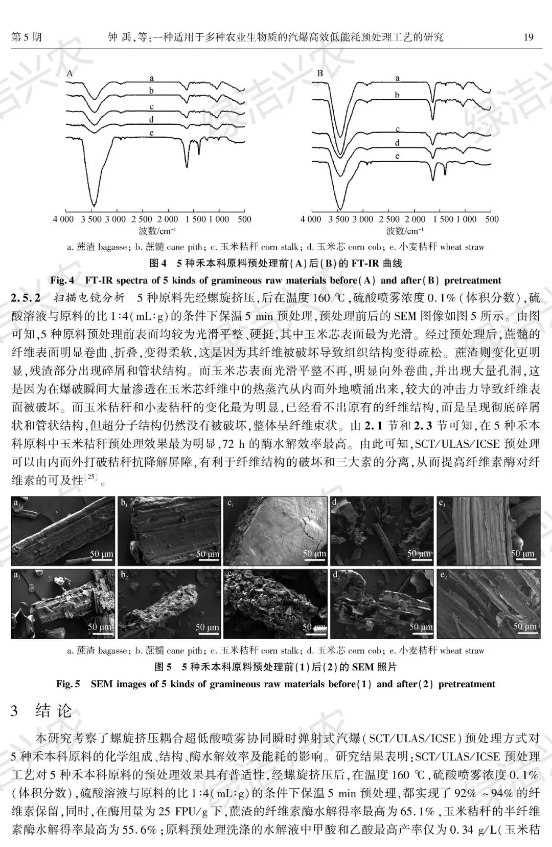 - 成分保留与脱除:5 种原料均保留 92%-94% 的纤维素,脱除 23%-34% 的半纤维素和 8% 以上的木质素,其中玉米秸秆木质素脱除率最高(14.6%),蔗渣半纤维素脱除率最高(34%)。