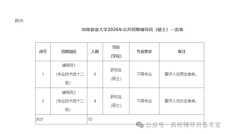 详见附件《河南农业大学2026年公开招聘辅导员(硕士)一览表》。