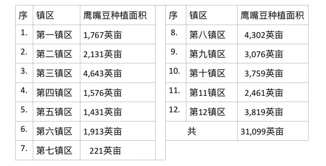目前在皎栖县区内的12个镇区中,每个镇区都种植了这鹰嘴豆,全县共种植了这作物3万多英亩。