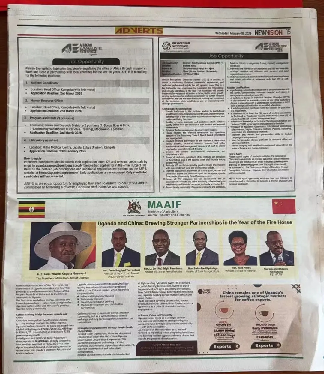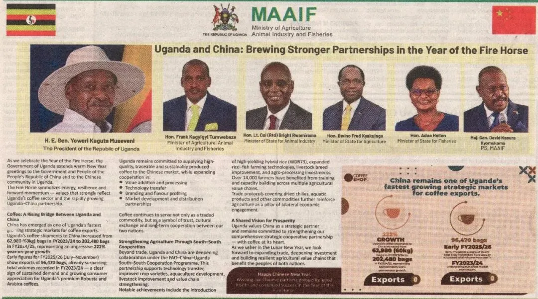 2026年2月18日,乌干达穆塞韦尼总统携乌干达农牧渔业部部长弗兰克、畜牧国务部长布莱特、农业国务部长布温诺、渔业国务部长阿多娥、常务秘书大卫在乌干达最大官媒《新愿景报》上发文,向中国政府和人民以及在乌华侨华人致以新春祝福,肯定中乌农业合作成就,祝愿中国合作伙伴事业兴旺,身体健康,再创佳绩!期待中乌两国在火马年共同打造更为紧密的合作伙伴关系。