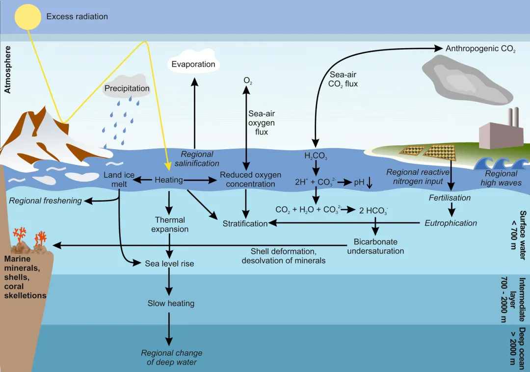 海洋酸化与甲壳剥离: 海洋吸收了人类排放的大量二氧化碳,导致海水pH值持续下降,发生海洋酸化。酸化的海水会消耗水体中的碳酸根离子,导致文蛤、牡蛎、扇贝等碳酸钙外壳生物的幼苗无法正常钙化结壳。整个贝类养殖产业的基础正在被从化学层面上瓦解。