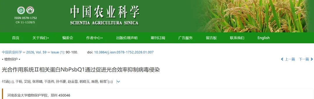 FU Han, YU Yang, AI Niu, ZHANG SiQing, YU LianWei, SUN ShuHao, ZHAO JinZhang, HAN XiaoYu, SHI Yan, YANG Xue. The Photosystem II Protein NbPsbQ1 Inhibits Viral Infection by Promoting Photosynthetic Efficiency[J]. Scientia Agricultura Sinica, 2026, 59(1): 90-100.