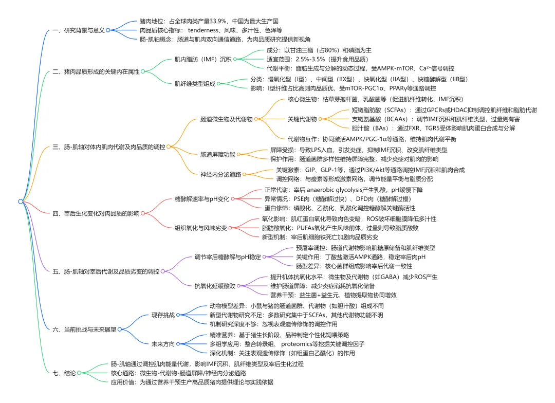 猪肉品质对人类健康及畜牧业经济发展具有重要意义。近年来,肠 - 肌轴概念的提出凸显了肠道菌群及其与宿主的互作在调控骨骼肌生理功能中的关键作用,为解析肉品质形成机制提供了全新视角。本综述总结了肠 - 肌轴对骨骼肌能量代谢的影响及其在调控猪肉品质分子机制中的作用,重点聚焦肌肉的两大核心内在特性 —— 肌内脂肪(IMF)沉积与肌纤维类型组成。系统阐述了肠道菌群、其代谢产物(短链脂肪酸、支链氨基酸、胆汁酸)以及肠道屏障功能和神经内分泌通路如何介导这些调控效应。在此基础上,进一步探讨了肠 - 肌轴对宰后肌肉生物学过程的持续影响,阐明了该轴通过减轻过度糖酵解、稳定 pH 值、增强抗氧化能力及调控风味劣变物质形成,从而改善猪肉食用品质并延缓肌肉劣变的潜在途径。最后,总结了当前肠 - 肌轴调控代谢进而影响肉品质与腐败的机制研究中存在的挑战及未来研究方向,旨在为通过靶向肠 - 肌轴的营养干预生产高品质安全猪肉提供理论基础与实践策略。