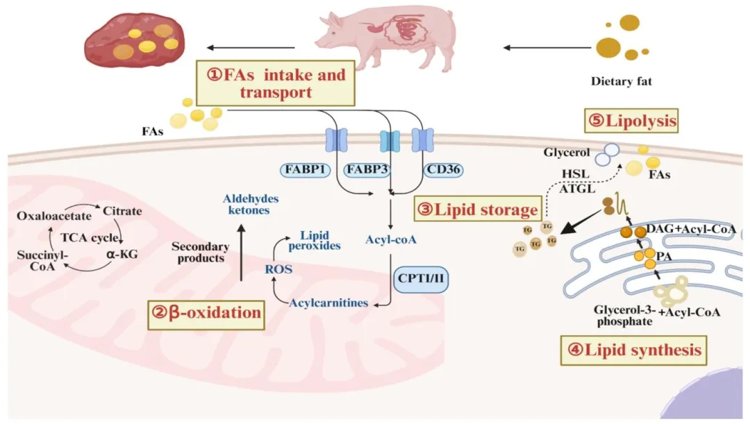 Fig. 1:调控肌内脂肪(IMF)沉积的代谢网络示意图。该过程包含脂肪酸(FAs)摄入与转运(①)、线粒体 β- 氧化(②)、脂质储存(③)、脂质合成(④)及脂肪分解(⑤)等关键步骤,这些过程在肌肉发育中动态平衡,对猪肉品质性状具有显著影响。