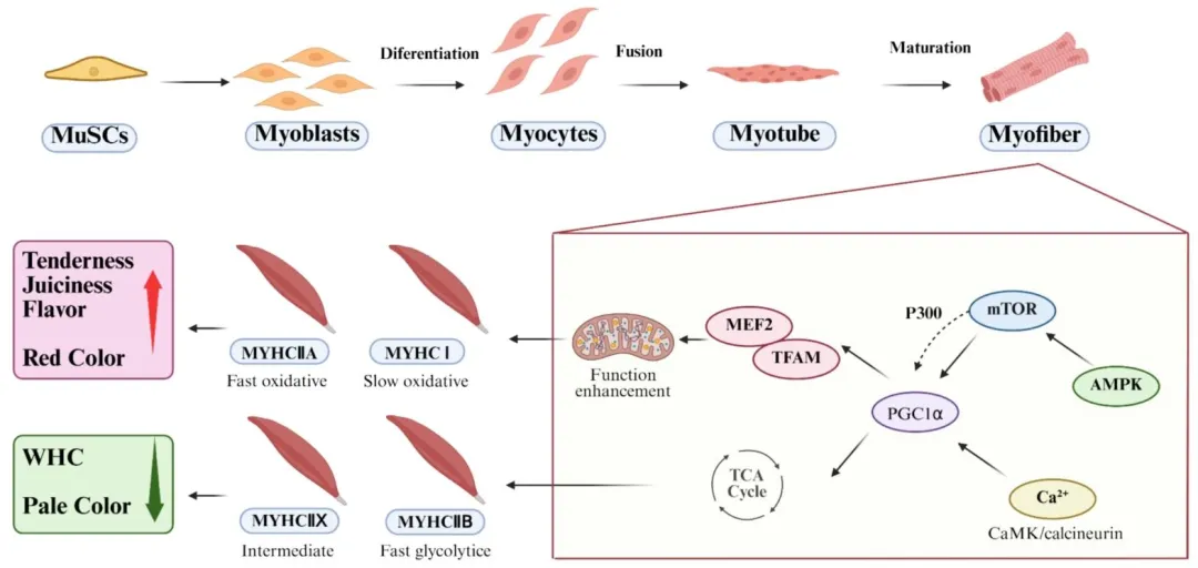 Fig. 2:猪骨骼肌纤维类型的分类及分子调控机制。骨骼肌纤维的发育是一个始于肌干细胞(MuSCs)的漫长过程,经历分化、融合、成熟等连续阶段,最终形成成熟肌纤维。在此过程中,肌管组装为功能化肌纤维,并根据代谢特性分为四种亚型:(1)慢氧化型(MYHC I)、(2)中间型(MYHC IIX)、(3)快氧化 - 糖酵解型(MYHC IIA)、(4)快糖酵解型(MYHC IIB),最终影响肉品质。雷帕霉素靶蛋白(mTOR)、过氧化物酶体增殖物激活受体 γ 辅激活因子 1α(PGC1α)、AMP 激活的蛋白激酶(AMPK)及钙(Ca²⁺)信号通路等关键调控因子,通过影响线粒体活性和生物能量代谢,驱动纤维类型特化与可塑性。