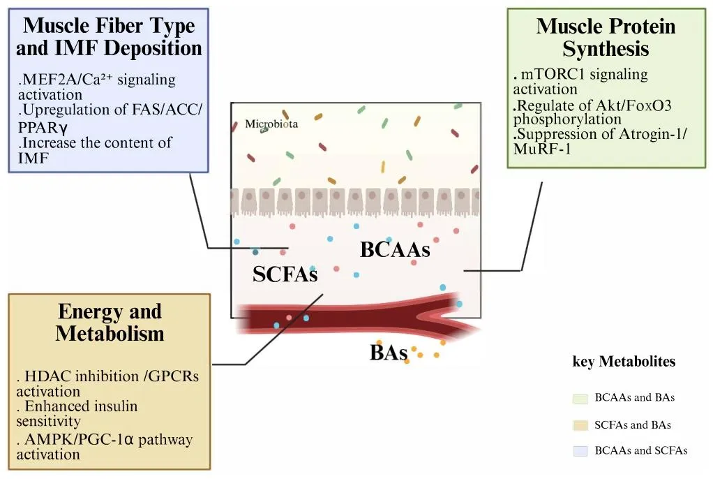 Fig. 3:肠 - 肌轴中微生物代谢物的信号交叉互作及对骨骼肌代谢的调控。该图展示了短链脂肪酸(SCFAs)、支链氨基酸(BCAAs)、胆汁酸(BAs)等关键肠道微生物代谢物通过肠 - 肌轴调控骨骼肌代谢的互作网络。SCFAs 与 BAs 通过增强胰岛素敏感性、激活 AMPK/PGC-1α 通路共同作用于 “能量与代谢”;BCAAs 与 BAs 通过激活 mTORC1、抑制泛素 - 蛋白酶体系统组件,联合调控 “肌肉蛋白合成”;SCFAs 与 BAs 协同影响 “肌纤维类型与肌内脂肪(IMF)沉积”,驱动慢肌纤维转化与脂肪沉积。