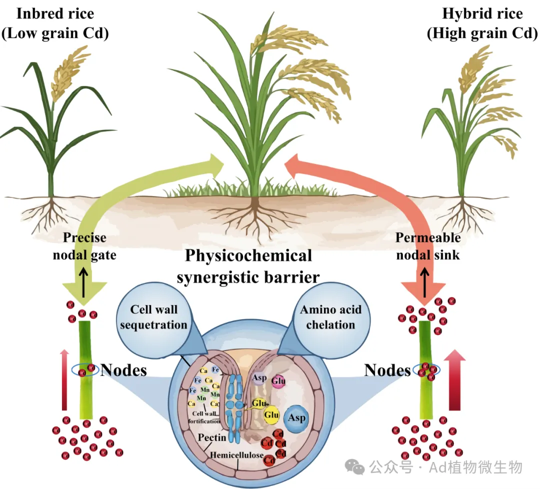 系统阐明了水稻茎节是调控稻米Cd积累的核心生理枢纽,其内在机制在于一个“物理-化学协同屏障”。该屏障的物理部分由富含果胶、半纤维素且经矿质元素强化的细胞壁构成,富含更多的结合基团,实现对Cd的高效胞外固持;化学部分则由高含量的蛋白质及关键氨基酸(特别是天冬氨酸和谷氨酸)驱动,完成胞内螯合。该发现将学术认知从聚焦膜转运蛋白拓展至茎节物理化学基质的决定性作用,揭示该屏障效率的基因型差异是导致品种间Cd积累能力分异的关键,为低Cd品种的精准育种提供了新靶点(Journal of Hazardous Materials, 2025, 498, 140020)。