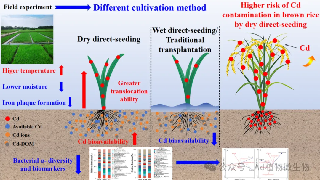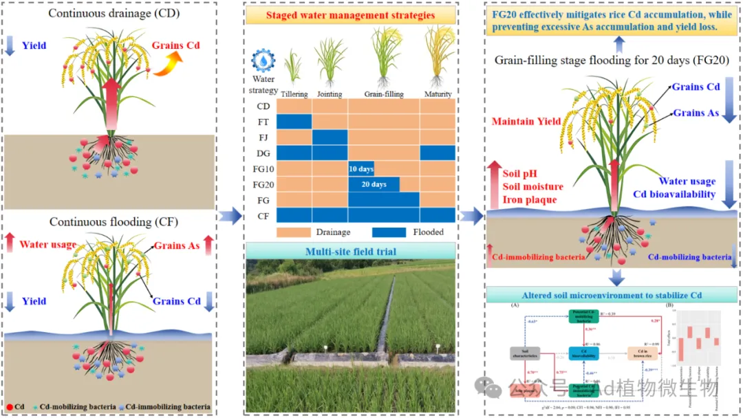 农艺实践通过系统性调控“土壤-根系-微生物”界面,决定了稻米中重金属的宿命。研究揭示,干直播栽培方式通过营造分蘖期好氧环境,加剧了土壤Cd的生物有效性,同时削弱了根表铁膜屏障并富集了Cd活化菌群,从而放大了稻米Cd污染风险。与此相对,灌浆期被证实是调控Cd吸收的关键窗口期,在此期间进行为期20天的精准淹水,可在有效降低稻米Cd浓度的同时,规避As的协同累积。该策略的成功在于其精准靶向调控了灌浆期的根际微环境:通过降低Cd生物有效性、维持铁膜屏障,并驱动微生物群落由“活化型”向“固定型”转变,最终协同阻断了Cd向稻米的转运(Science of the Total Environment, 2024, 933, 172875;Environmental Pollution,2025, 377, 126455)。