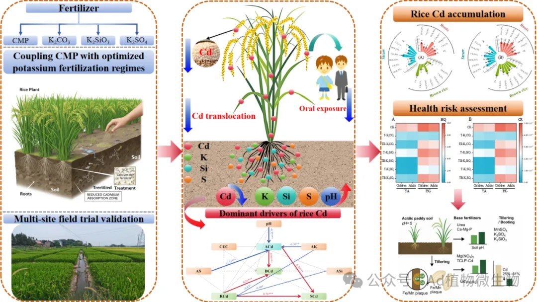 提出了基于“基肥调控土壤环境+追肥强化生理拮抗”的双效协同钝化新策略。创新性地以钙镁磷肥(CMP)等构建碱性基肥体系,在此基础上,通过在分蘖期等关键窗口精准追施硫酸锰、硅酸钾等功能性肥料,将土壤钝化(提升pH)与植物生理拮抗(Cd-Mn竞争、Si抑制吸收)有机结合,突破了传统钝化依赖单一高量投入的模式,构建了一套低成本、高效率、多靶点协同作用的原位调控技术方案(International Journal of Environmental Research, 2024, 18, 56; Agriculture, 2025, 15, 1052)。