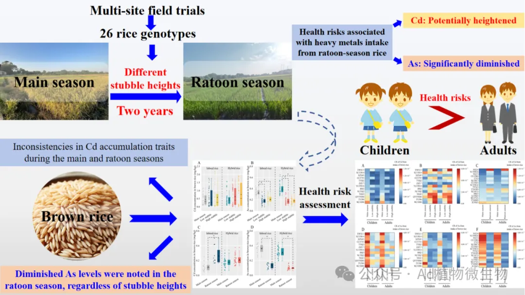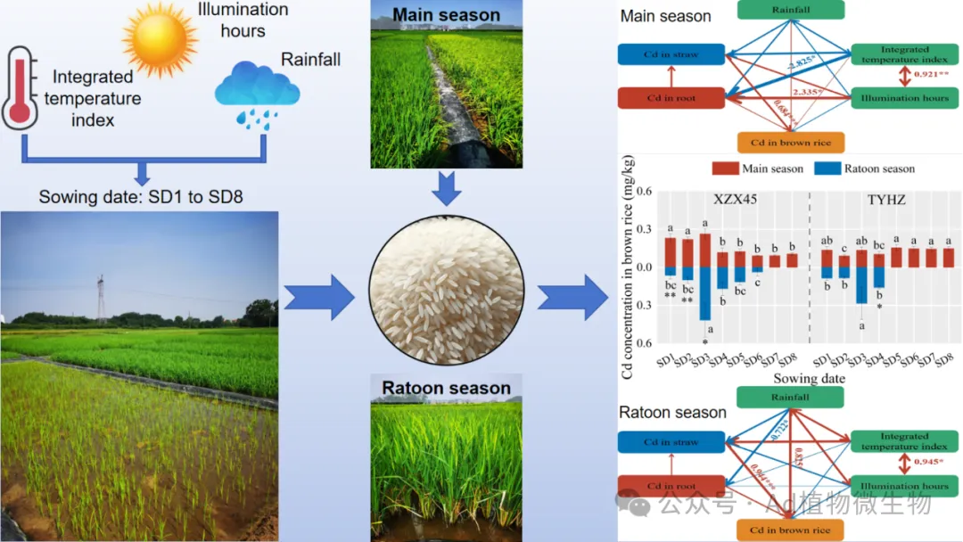 发现并证实了Cd与As在再生稻系统中截然不同的跨季迁移规律和“非对称性”风险。大规模田间试验证明,与头季相比,再生季稻米中As浓度普遍显著下降,而Cd在再生季不呈一致下降,部分品种反而升高,头季表现低Cd特性的品种,再生季不一定低Cd,且Cd受“品种×留茬高度”的显著共同作用。进一步将再生稻核心农艺措施(播期)与环境因子(气象)进行耦合分析,定量解析了其对再生稻Cd污染风险的驱动作用和互作效应,并创新性地提出了针对不同熟期品种的播期优化策略,为实现农艺避险提供了科学依据(Journal of Cereal Science, 2024, 120, 104046; Journal of the Science of Food and Agriculture, 2025)。