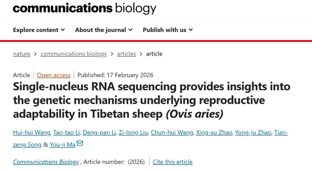 2月17日,甘肃农业大学马友记教授和李讨讨副教授团队在国际权威期刊Nature子刊-生物学领域顶刊《Communications Biology》(中科院1区Top)上在线发表了一项题为“Single-nucleus RNA sequencing provides insights into the genetic mechanisms underlying reproductive adaptability in Tibetan sheep (Ovis aries)”的最新研究成果,论文第一作者为甘肃农业大学领头羊计划学员王慧慧,马友记为通讯作者。