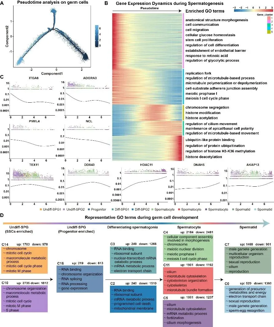 该研究运用单细胞核转录组测序(snRNA-seq)技术,构建了西藏羊在新生、性成熟前、性成熟后及成年四个关键发育阶段的睾丸单细胞核转录组图谱。主要发现包括:1)精原干细胞存在静息与活跃两种状态,其命运受代谢重编程及关键信号通路协同调控;2)支持细胞呈现五种转录状态,沿一条连续发育轨迹有序转变,揭示了其从早期血睾屏障构建,到成熟期代谢与免疫协同功能转变的动态规律;3)通过分析睾丸微环境中细胞间通讯网络,揭示了精子发生过程中支持细胞与生殖细胞的阶段性通讯策略。基于这些发现,本研究首次从单细胞核分辨率绘制了西藏羊睾丸发育的细胞动态图谱,阐明了生殖细胞分化轨迹及支持细胞功能成熟规律,揭示了细胞间阶段性通讯策略及关键基因的调控作用,为理解高原哺乳动物精子发生机制提供了重要理论依据。