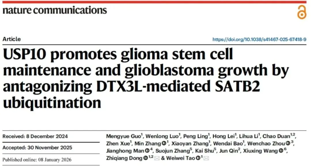 近日,华中农业大学陶伟伟研究员与董志强教授带领的团队在国际知名期刊《Nature Communications》上共同发表了一项关于胶质母细胞瘤发病机制的创新性研究成果。该论文揭示了去泛素化酶USP10在维持胶质瘤干细胞特性及推动肿瘤进展中的关键作用,为这一恶性脑肿瘤的精准治疗开辟了新的思路。
