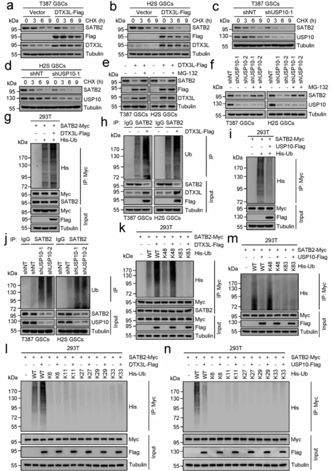通过免疫共沉淀联合质谱分析技术,研究人员成功筛选出两个与SATB2存在相互作用的关键蛋白,去泛素化酶USP10和E3泛素连接酶DTX3L。进一步的定位分析显示,这两种蛋白主要富集于胶质母细胞瘤内部的胶质瘤干细胞亚群中,但USP10的表达水平明显高于DTX3L。功能表型分析揭示出两者呈现出截然相反的生物学效应:USP10对胶质瘤干细胞的自我更新能力及肿瘤生长具有促进作用,而DTX3L则能够抑制这些过程。