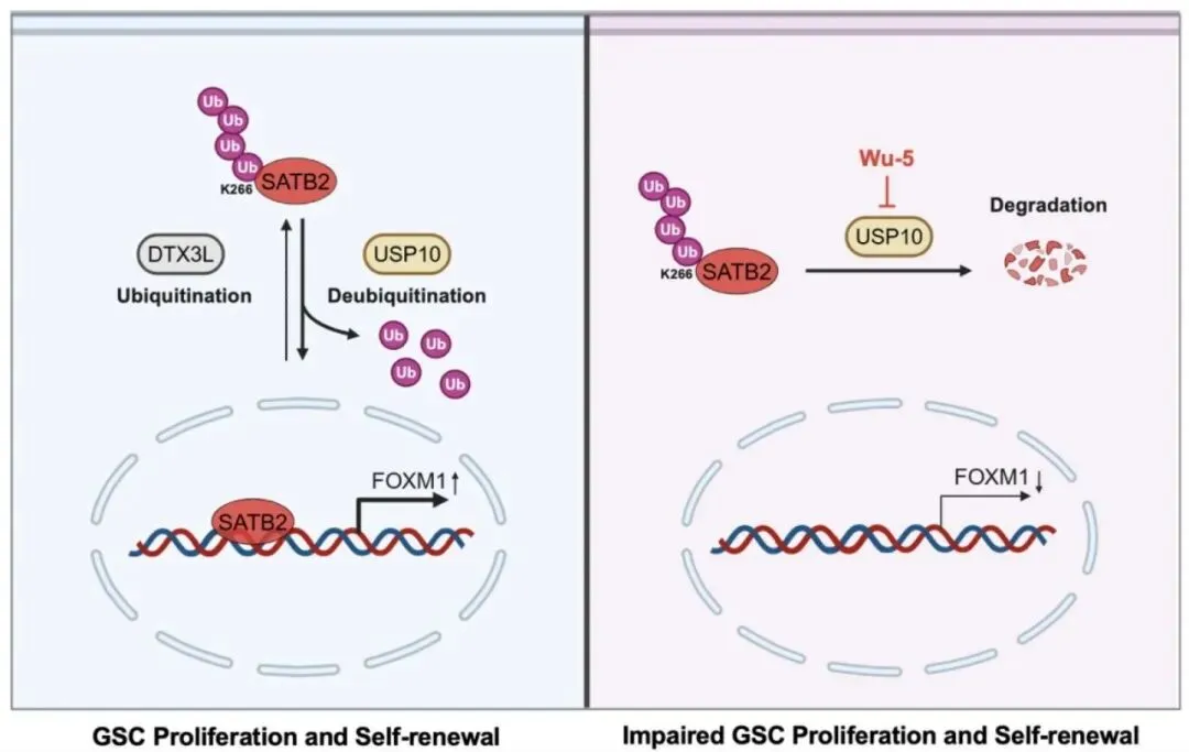 综合而言,这项研究完整描绘了USP10与DTX3L通过拮抗作用调控SATB2 K266位点泛素化水平的分子通路,揭示了该通路如何影响SATB2蛋白稳定性及核定位,进而通过下游FOXM1基因驱动胶质瘤干细胞自我更新和胶质母细胞瘤颅内生长的完整机制。利用小分子药物Wu-5靶向抑制USP10活性,可有效打破这一稳态平衡,诱导SATB2降解,从而显著抑制胶质瘤干细胞功能和肿瘤进展。这一发现为胶质母细胞瘤的药物开发提供了具有潜力的新靶点和干预策略。