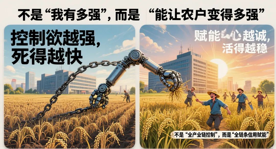 对比深农芯模式:农户数据确权→生成电子仓单→银行质押放款→农户分享金融收益,从"被剥削者"变成"股东"。