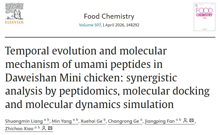 2026年2月,云南农业大学食品科学与技术学院的肖智超副教授团队在国际食品TOP期刊《Food Chemistry》(Q1,IF=9.8)在线发表题为“Temporal evolution and molecular mechanism of umami peptides in Daweishan Mini chicken: synergistic analysis by peptidomics, molecular docking and molecular dynamics simulation”的研究型论文。云南农业大学博士研究生梁双敏为第一作者,通讯作者为云南农业大学食品科学技术学院肖智超副教授与范江平教授。