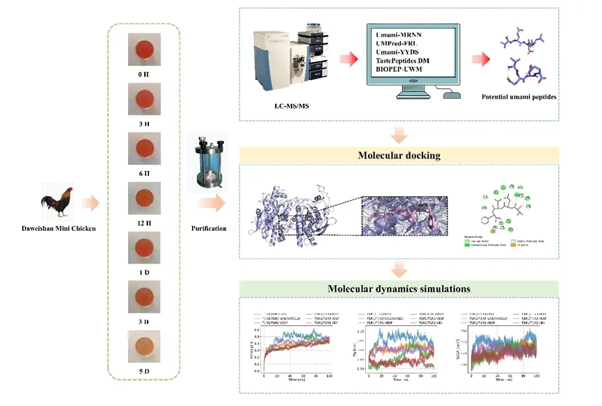 大围山微型鸡鲜味肽的时间演变与分子机制:肽组学、分子对接与分子动力学模拟的协同分析