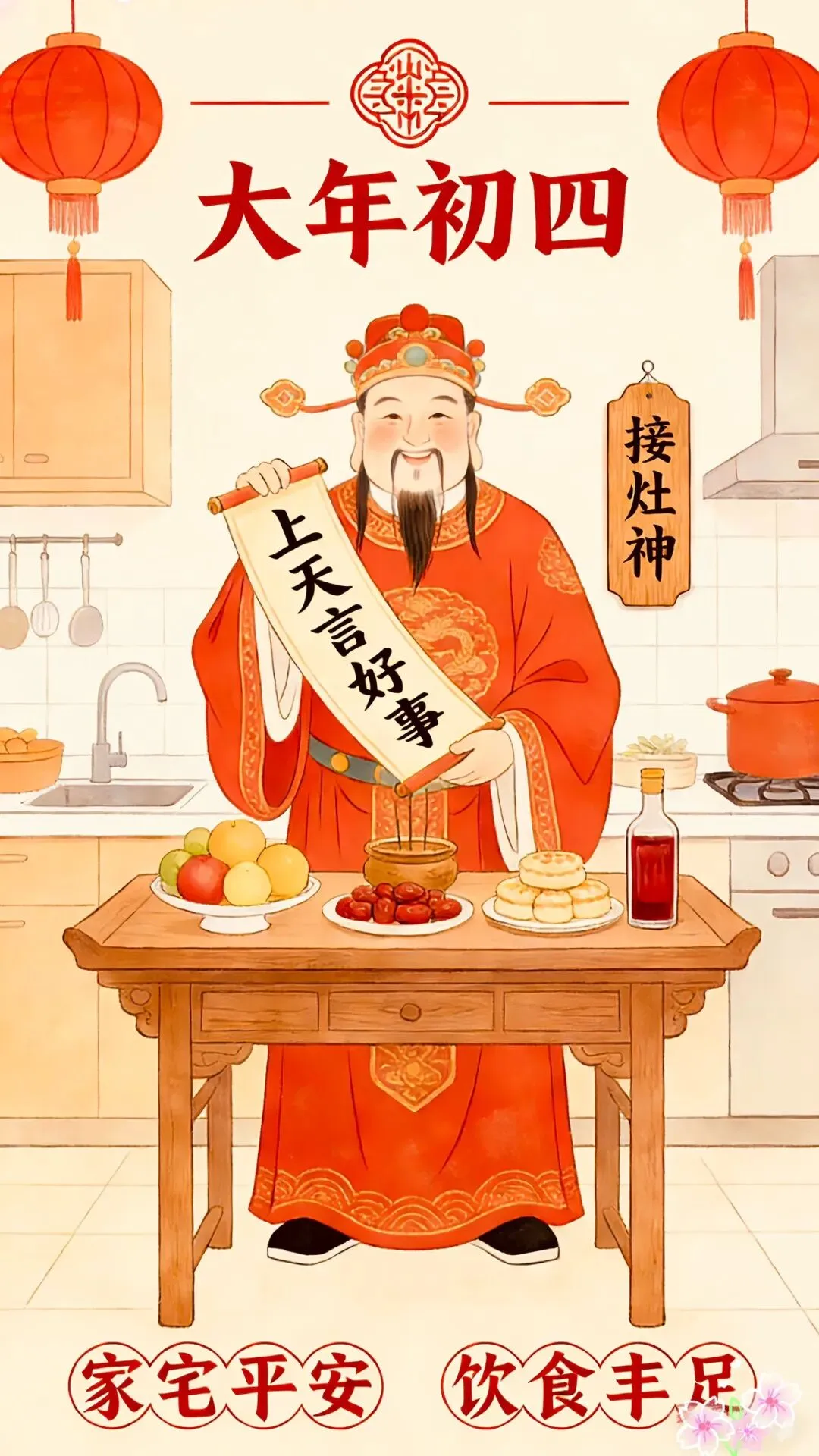 民间认为,灶王爷(灶神)在腊月廿三/廿四“上天言好事”,向玉帝汇报家庭一年善恶,到正月初四(或初五)返回人间。因此,初四需“接灶神”归位,祈求新一年家宅平安、饮食丰足。