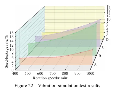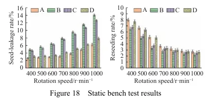 通过二次优化试验,确定最佳参数组合:通孔直径为1.7 mm,充种空间为39.3°,转速为657.4 r/min。进行静止台架验证试验和室内振动环境模拟试验,并选取对照组进行效果比对。结果表明当排种盘转速为在400 r/min~1000 r/min内变化时,优化结构后的排种盘漏播率低于7.6%,各项指标均优于原始排种盘,充种和携种稳定性有明显提升。