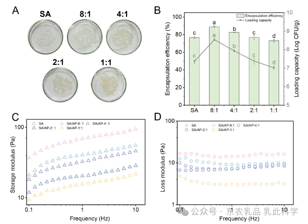 图2.不同SA/AP复合比例制备的微胶囊照片(A)、包封率及载菌量(B)、储能模量G’(C)和损耗模量G''(D)