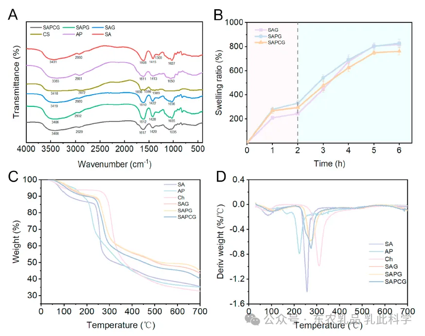 图5.(A)不同物质的傅里叶变换红外光谱(FTIR);(B)微胶囊溶出率;(C)不同物质的热重分析(TGA)曲线;(D)不同物质的微分热重(DTG)曲线。
