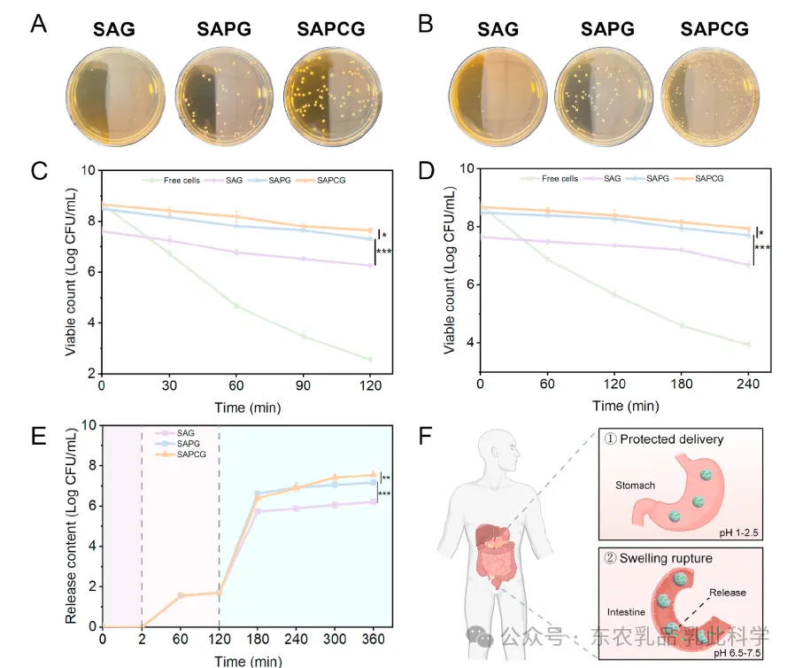 图6. 微胶囊的抗消化及模拟释放特性。(A)模拟胃液(SGF)处理120 min后微胶囊中益生菌活菌数(稀释10⁶倍);(B)模拟肠液(SIF)处理240 min后微胶囊中益生菌活菌数(稀释10⁶倍);(C)微胶囊对模拟胃液(SGF)的耐受性;(D)微胶囊对模拟肠液(SIF)的耐受性;(E)微胶囊中益生菌的模拟释放情况;(F)微胶囊中益生菌体内释放示意图。
