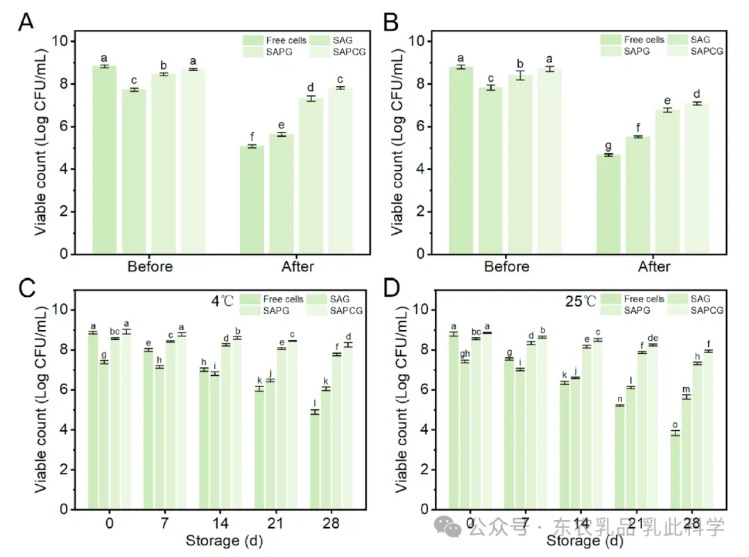图7.微胶囊对冻干的耐受性(A)、对热处理的耐受性(B)、在4℃下的贮藏稳定性(C)、在25℃下的贮藏稳定性(D)。